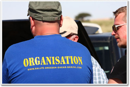 Die ganze Zeit durch Mauretanien begleiteten uns Guides der Armee sowie zwei Beduinen-Führer, die die Wege durch die Wüste kannten. Nun war es also soweit - der "Dust-Teil" der Rallye begann. Hierauf haben alle Teams hingefiebert, einmal mit dem Auto durch die Wüste donnern und das (fast) ohne Regeln. Es musste nur noch der Reifendruck angepasst werden - ca. 60% wurden abgelassen, und schon waren alle Teams bereit.