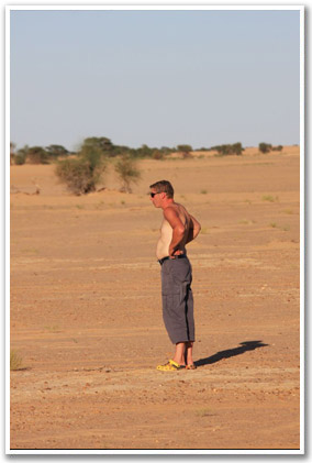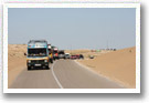 Nach dem Frühstück packten wir unsere Sachen zusammen. Um 08:00 Uhr war das Morgenbriefing, wo wir die Tagesstrecke erfuhren. Es ging zuerst 70 Kilometer der Straße entlang, dann führte uns der Weg direkt ab in die Wüste. Unser Ziel war es, bis zur Dämmerung so weit wie möglich zu kommen und dann irgendwo ein Nachtlager aufzuschlagen. Das Fahren bei Dunkelheit war nicht möglich, da man zur Sicherheit unbedingt eine gute Sicht haben muss.