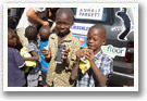 Voller Schulmaterial fuhren wir anschließend in Richtung Lambai Nursery School. Lamin, der Direktor der Schule, wartete an einer uns bekannten Kreuzung und wies uns, nachdem wir Ihn und sein Fahrrad in und auf unserem Auto verstaut hatten, den Weg durch die Dörfer zu Schule. Es war Samstag und deshalb natürlich schulfrei aber Lamin ließ uns kurz vor der Schule anhalten, rief einigen Kindern etwas zu, die sofort davon flitzten, und wenige Minuten später füllte sich der Schulhof mit lachenden Kindern in Schuluniform. Belohnt wurden die Kleinen mit Spielzeug und Stiften aus unserem Auto und natürlich war die Freude wieder groß, als wir sie fotografierten und Ihnen die Fotos auf dem Display zeigten.